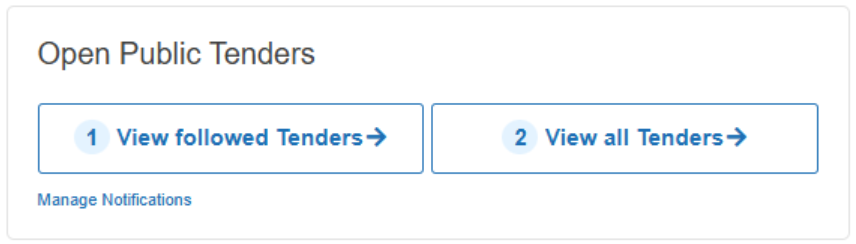 Public Tenders are listed under Open Market Tenders. You can click View all Tenders on your dashboard and select a tender to follow. Tenders you are following will then appear under View Followed Tenders.