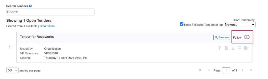 - For Public Tenders, you need to Follow the tender to view all details, download files, and access key actions.