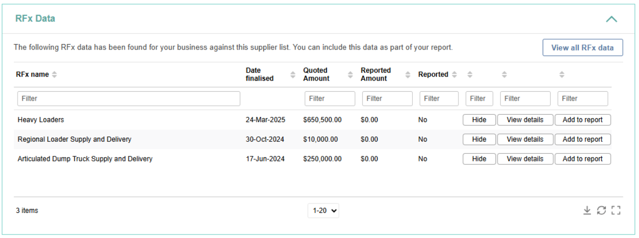 - You can hide an RFx from the list if it is not yet ready to be reported on.