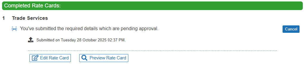 After submitting, a new page will confirm that your submission is pending approval. You will receive an email notification once your submission is approved or declined. You can also select Edit Rate Card or Preview rate card from this page.