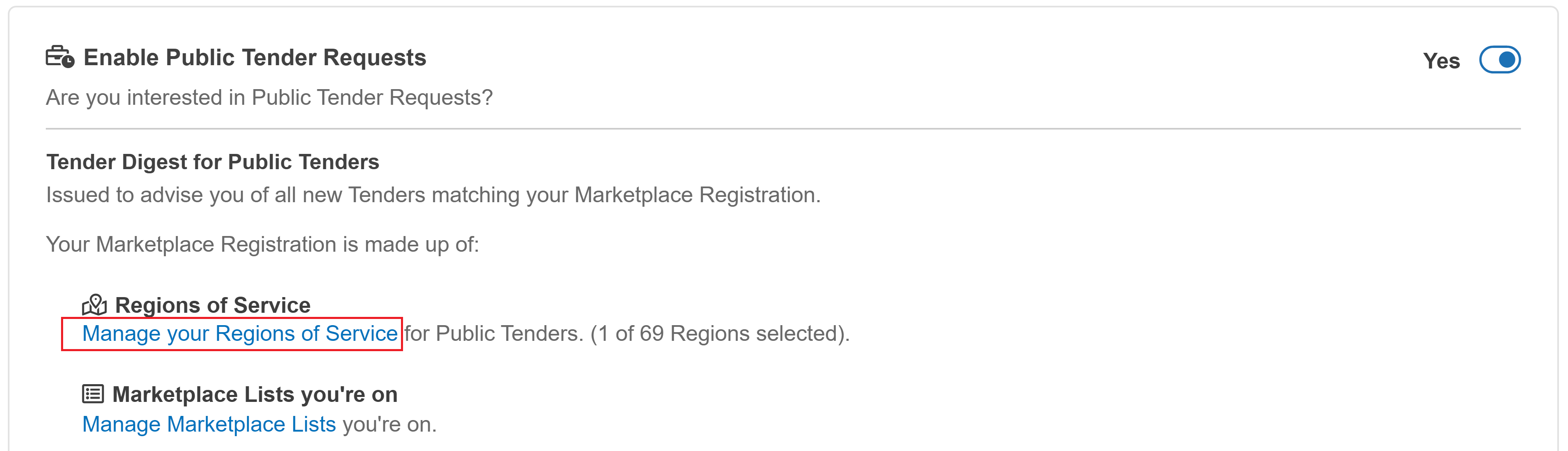Your Tender Digest is created based on three criteria: Regions of Service, Marketplace Supplier Lists, and Marketplace Categories.