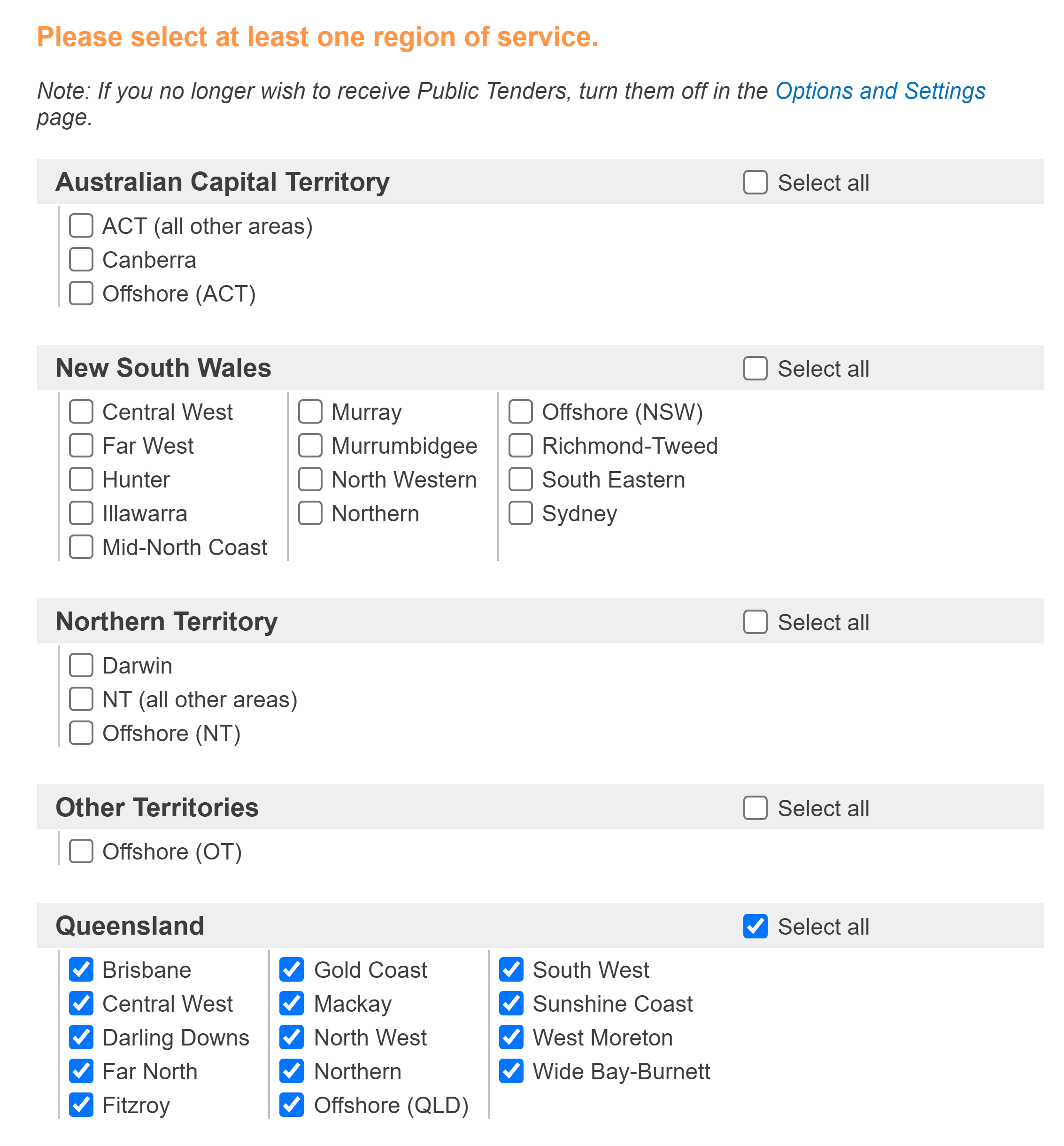 Select/deselect the Regions of Service to reflect the areas where you are able to perform work.