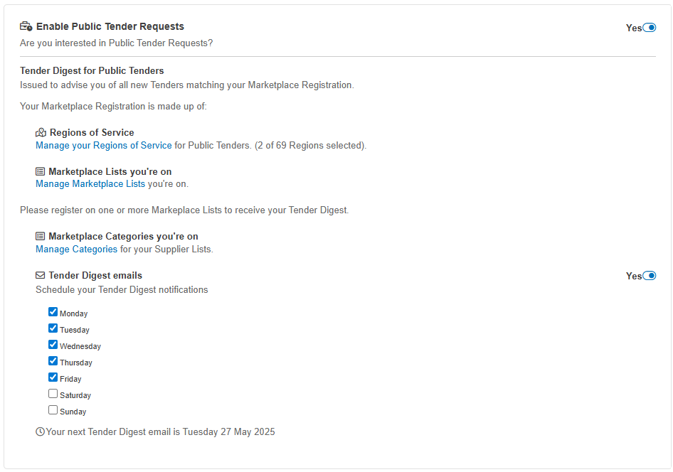 This setting allows you to choose whether you'd like to receive the opportunity to respond to public tenders from the Marketplace lists you're registered on.