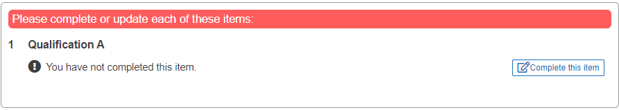 - You will see a list of all qualification requirements set for that list. Click the Complete this item button on the right to view the details of a specific requirement.