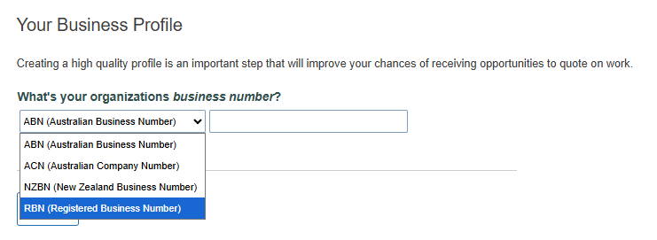 Use a Registered Business Number (RBN) instead of an Australian Business Number (ABN) to complete your supplier profile if your business is not based in Australia.